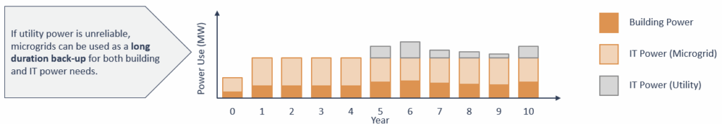 It is a common misconception that when data centers are connected to utility power, any microgrid established to bridge load becomes a stranded asset. Even when there is interconnection available, microgrids offer many benefits over utility grid power. Data center developers could use microgrids concurrently with utility power as mechanical power load, back-up power supply during outages, and excess power exports. Alternatively, developers could employ microgrids that replace utility power entirely.